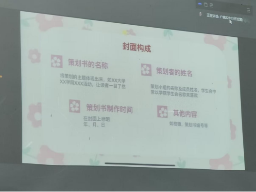 王祉萦首先讲解什么是策划书,策划书的四种构成要素,以及策划书的作用:是提高市场占有率的有效行为,如果是一份创意突出,而且具有良好的可执行性和可操作性的策划书,无论对于企业的知名度,还是对于品牌的美誉度,都将起到积极的提高作用。接着提出策划一场活动需要丰富自己的知识、提升审美创新能力、做好联络配合工作的观点。