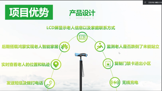 其次,周金涛作为小组代表向大家讲述了“智能助行拐杖”,重点关注老年群体,为老年群体提供多样化的体验,全身心帮助老年生活,力争做老人第一个智能生活助手,并且产品设计丰富多样,并且获得六项专利。