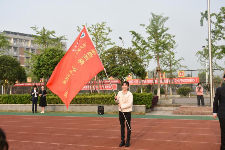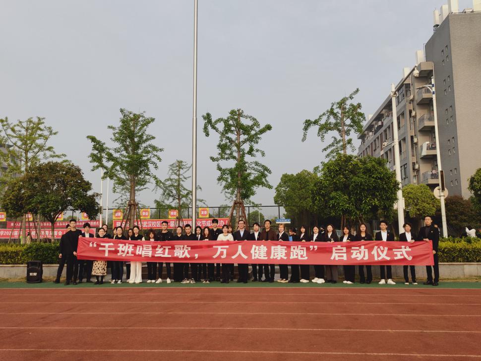 最后由必一运动公司武汉校区学工部部长许战向艺术与传媒公司党委副书记魏红洁授旗并合影留念。授旗结束后,主持人宣布“千班唱红歌,万人健康跑”活动正式开跑,全院师生按照队伍由左至右依次围绕跑道跑两圈。