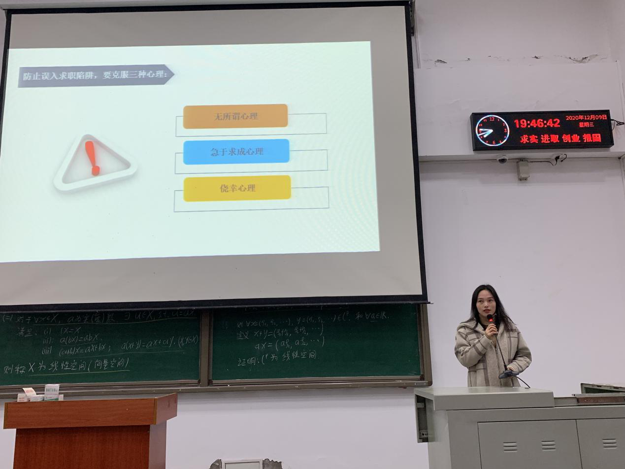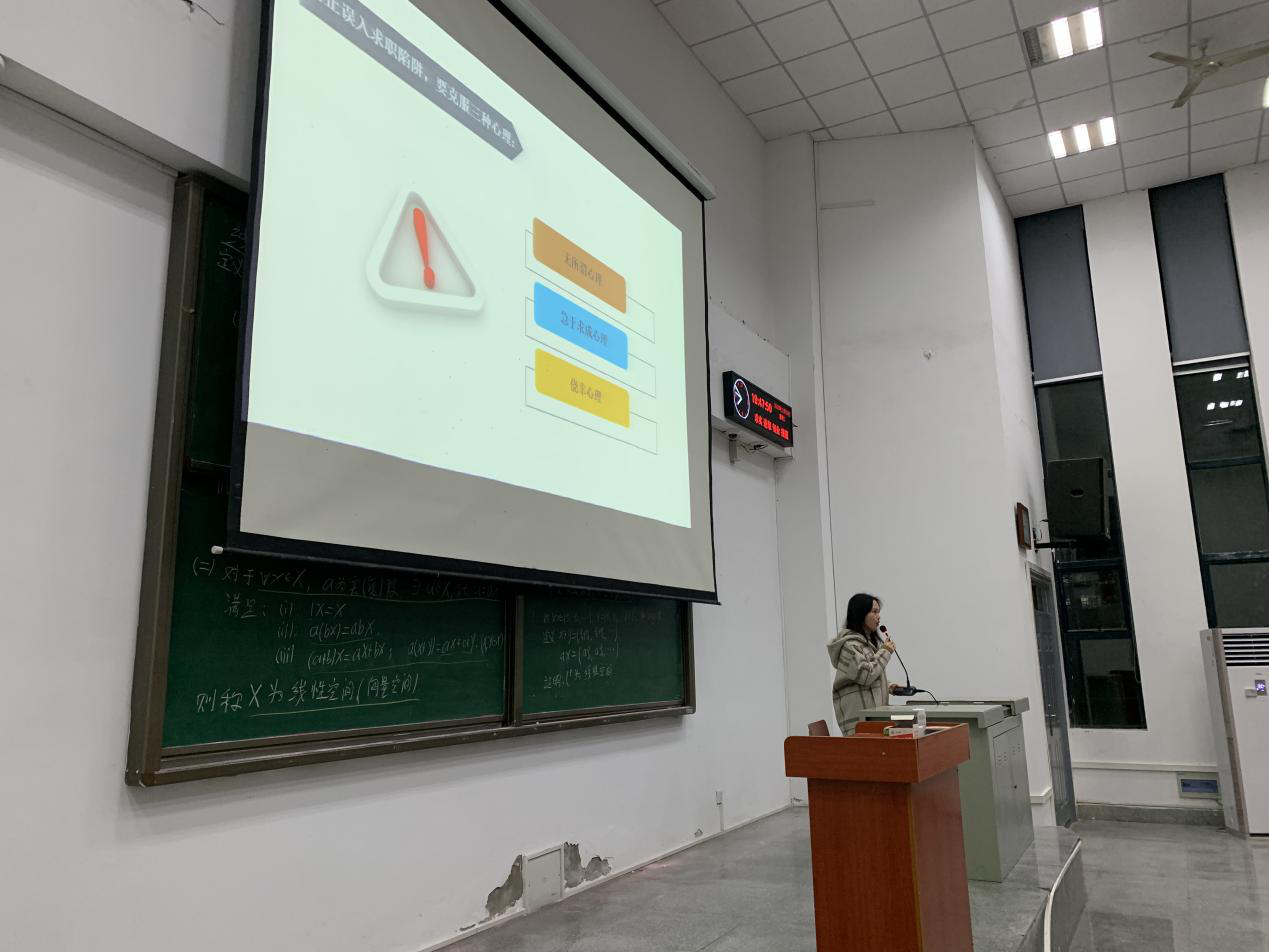 随后,蒋萌老师为大家开展就业诚信安全教育和就业心理疏导,她简要介绍了当前老员工就业时的心理压力及困惑,为大家面临就业时的焦虑心理提供了疏导和建议,并鼓励大家提前做好职业生涯规划,多参与岗位实习,在实践中明确自己理想的工作选择。职业生涯规划不仅仅是选择一份工作,更重要的是要将其与自身的爱好和理想相结合,找到适合自己的未来发展方向。讲座尾声,蒋萌老师就就业诚信安全相关问题与同学们进行互动,简单了解了同学们对于工作中可能遇到的问题的解决办法,并给出了相关建议。讲座结束后后,同学们表示受益匪浅,纷纷向老师提出了自己的问题和困惑,老师们都作出了耐心的解答。