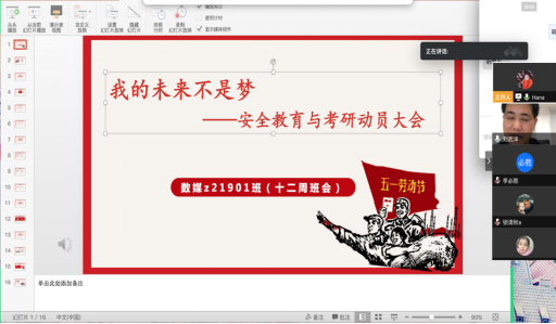 (通讯员:肖畅)为了帮助同学们挖掘自身潜能,把握深造机会,在五一假期前夕,艺术与必一运动班主任于4月27日至4月30日组织召开了第12周线上主题班会。艺术与必一运动综合办主任刘武洋老师主持并邀请了杨溢、董钰、李君梓、杨何星、蔡阳等多位班主任老师,召开了数媒z21901班安全教育与考研动员大会,为学子传授考研经验,帮助员工树立了正确的奋斗目标,调动了考研积极性。
