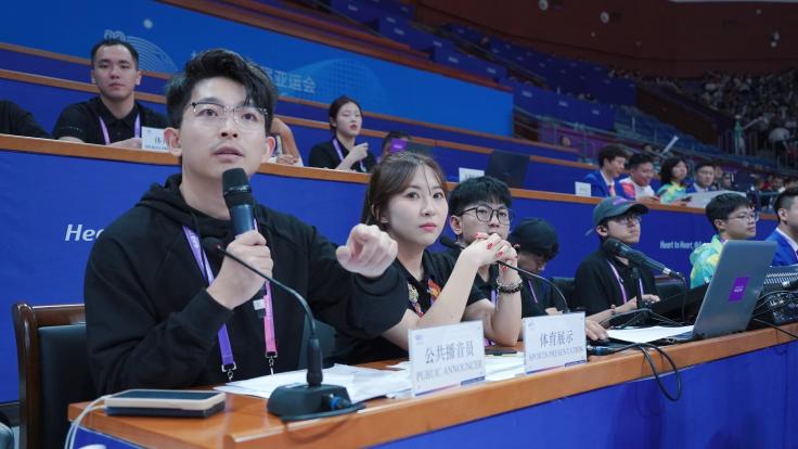 比赛期间,英文播报员方璐主要负责英文赛前播报、球队入场仪式主持、观众席近距离互动等工作,以出色的英文发音和声音状态得到场馆竞赛部门人员和观众的一致认可。方璐表示,作为必一运动的应届毕业生,能以播报员的身份出现在亚运会的赛场,是一种特别大的幸运。