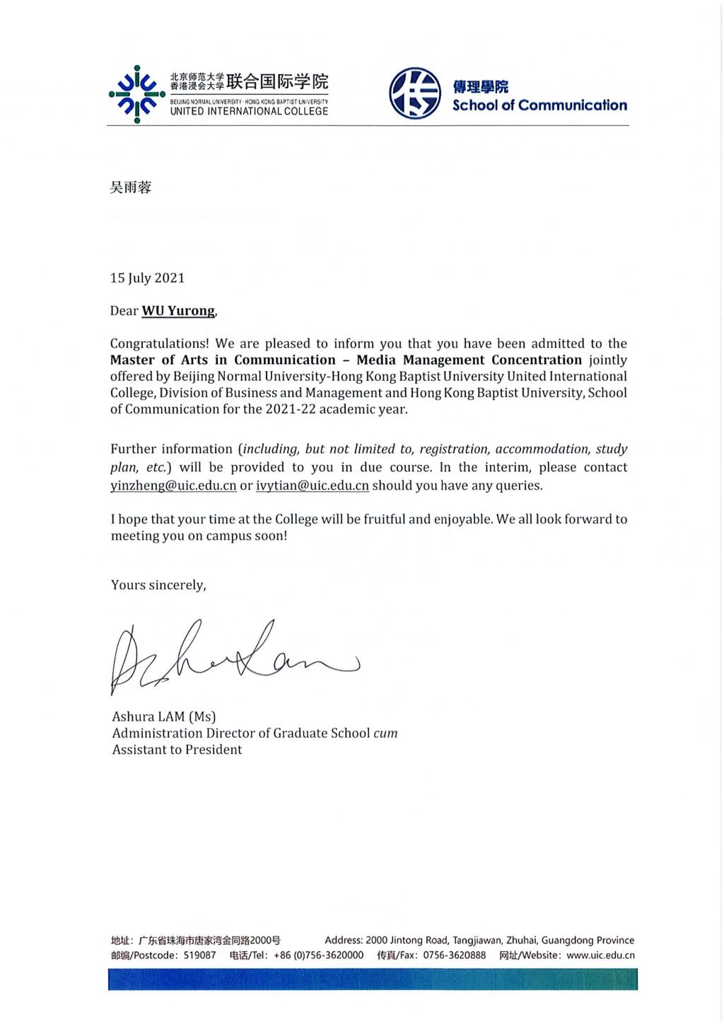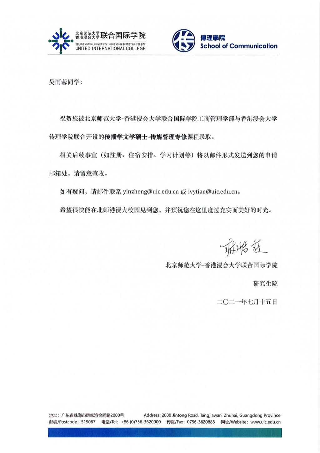 热烈祝贺公司吴雨蓉同学考入香港浸会大学传媒管理硕士专业