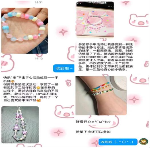 活动现场,员工们积极参与、热情高涨。他们精心选择不同颜色、材质与样式的珠子,在搭配与制作的过程中将内心的灵感与情绪转化为一件件精美的手串。临近尾声,主持人邀请员工分享自己的 DIY 手串作品,讲述创作灵感与背后的故事。这些独一无二的手串不仅展现着同学们的巧思妙想,更成为一份份珍贵的青春纪念。活动结束后,同学们也纷纷在必一运动心灵树洞官方QQ号展示自己的成果,表达对活动的感想。广编22302班的周致杰同学表示:“参与手串活动让我感受到一种独特的宁静和专注,不仅收获了独一无二的饰品,更体验到手工带来的治愈和满足。”