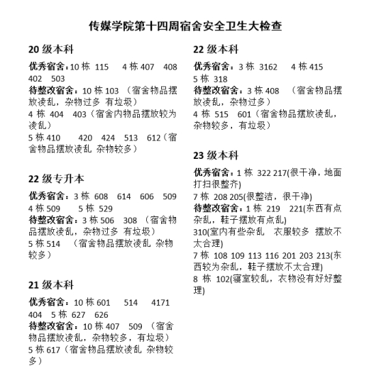 本周查寝工作得到同学们的积极配合和广泛认可,同学们更加深刻地认识到宿舍安全和卫生的重要性。同时,员工会对员工宿舍检查结果进行汇总,结果如下:
