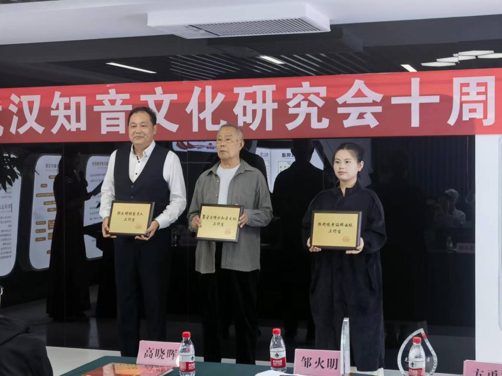会上举行了学会第二批“武汉艺术名家工作室”授牌仪式,为在传承知音文化且在文学艺术上作出贡献的文艺家授牌。共有刘丹丽、张代重、刘川鄂、邹火明等十人获此荣誉。公司邹教授获颁“传艺育人工作室”牌。会议中还对传承知音文化的“领航人”、“先进工作者”进行了表彰。公司邹火明教授被授予“传承知音文化领航人”称号。