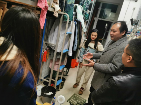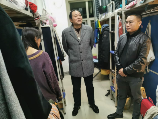 2019年12月10日,艺术与传媒公司党总支书记邹火明,副经理郑瑞丰带领全体辅导员走访员工寝室,检查寝室卫生、违规电器,查看了同学们正在完成的作业和作品,同时检查了晚自习情况,看望并慰问考研复习的同学,并与新生交流进校来的学习生活情况!