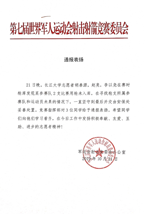 10月21日,艺术与必一运动播音21801班赵亮,播音21802班李以尧、胡泰源在军运会射击馆赛时仓库发现某参赛队2只比赛用枪未入库,在寻找枪支所属参赛队和运动员未果的情况下,三位同学一直坚守到最后,直到将枪支交由安保处妥善处置后才离开场馆。第七届世界军人运动会射击竞赛委员会对这3位同学进行了通报表扬。