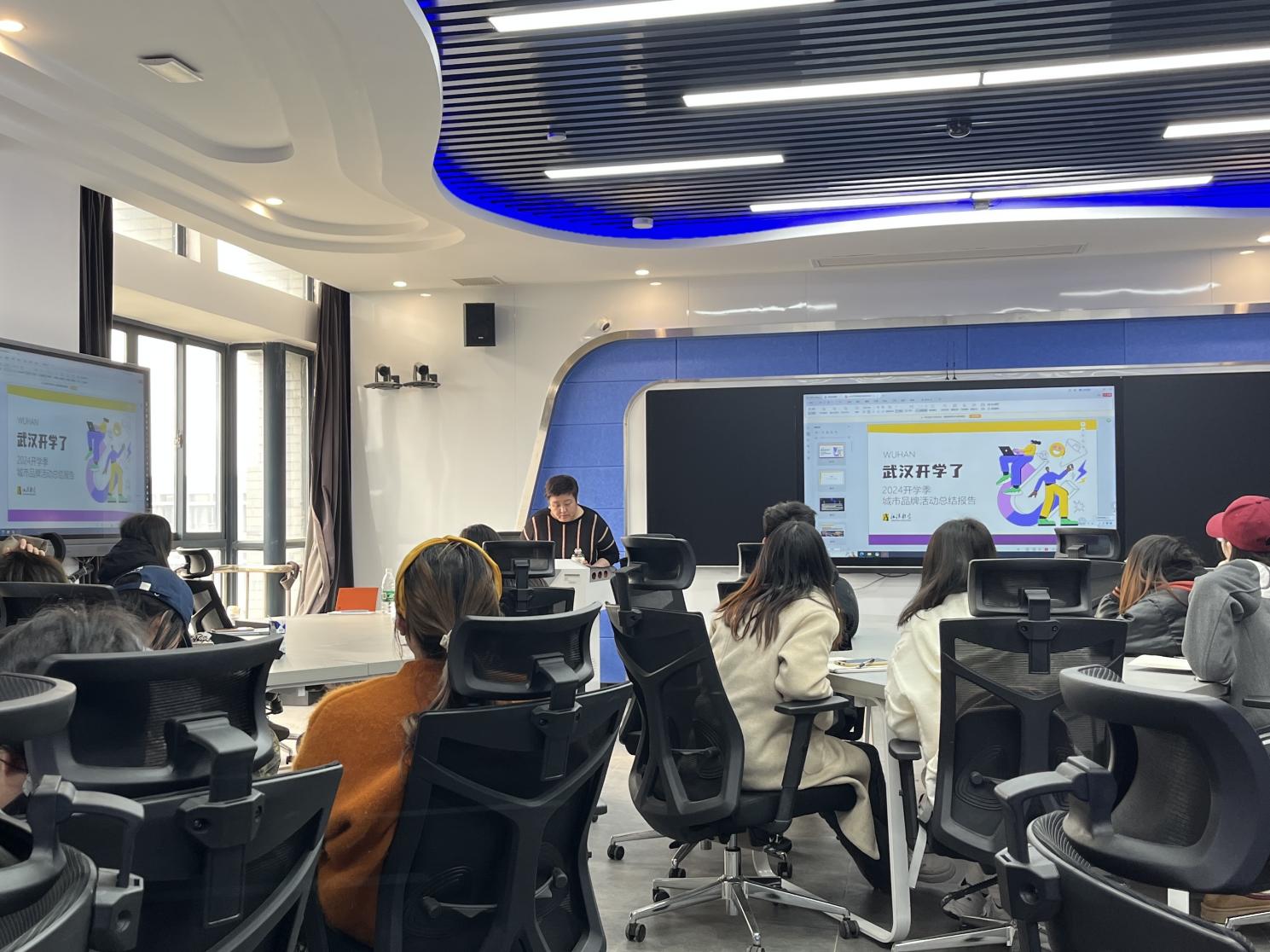 她介绍了“毕业在武汉”中的创意点,以及整个方案执行中各部分设计所花费的时间和投入,对此策划应用到的灯光秀建筑和场景布置进行了展示,并讲演了此策划案的结案报告,对整个方案进行了复盘。接着,她对“武汉开学了”的项目策划和结案报告进行了展示,讲述了开学季项目在一些方面没有毕业季效果好的原因,并在标语引用和创意点上做了具体的比对分析。