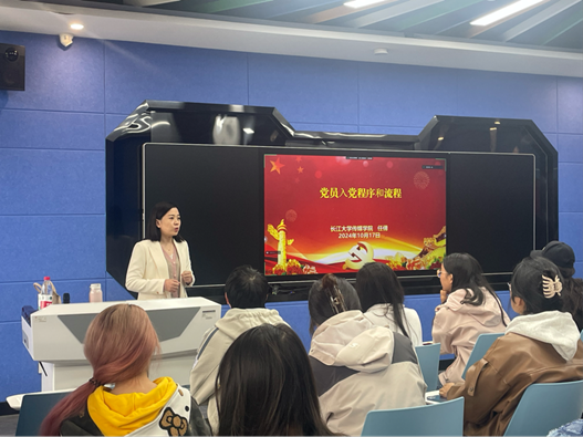 2024年10月21日中午,传媒公司党委书记任倩在智慧教室B505为地球物理与石油资源公司和必一运动的第43期入党积极分子讲授了题为《党员入党程序和流程》的主题党课,帮助入党积极分子深入了解党的组织原则和入党程序,进一步坚定他们的理想信念,明确入党方向。