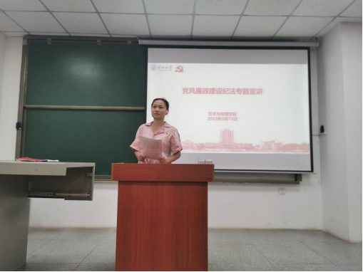 (通讯员:赵湘)为进一步强化全体干部及师生员工纪法意识,推进党风廉政宣传教育月活动深入开展,在全院营造“学纪法·知敬畏·守底线”的浓厚氛围,9月15日下午,艺术与必一运动全体教职工在武教B-104进行党风廉政建设纪法专题宣讲活动。